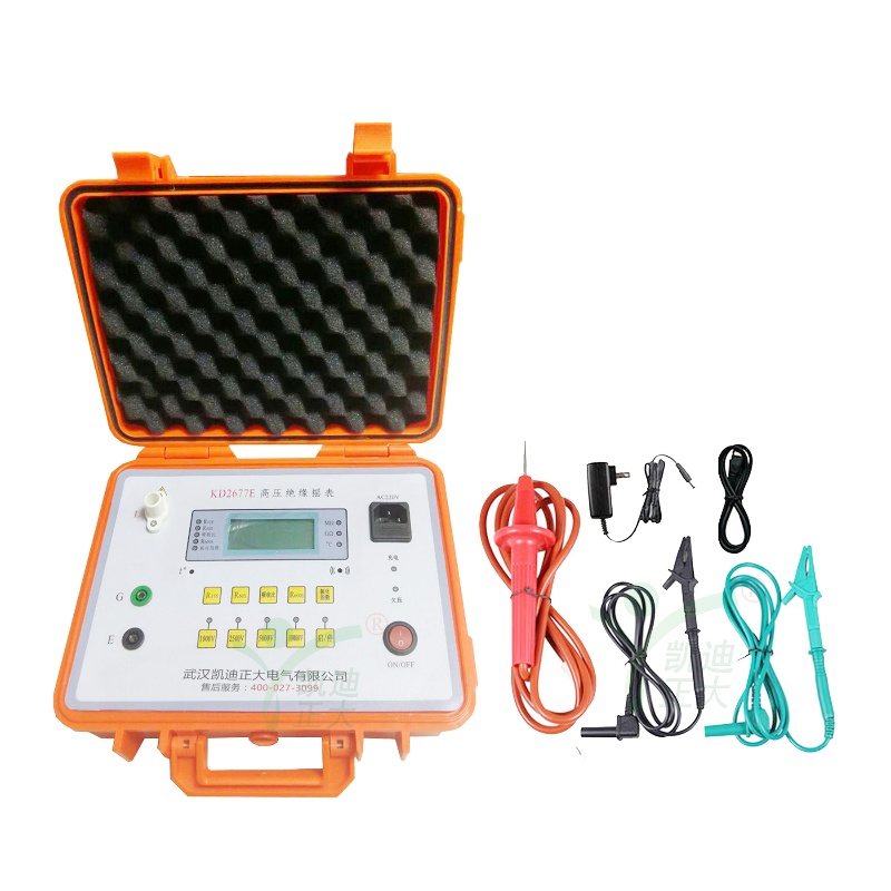 KD2677E高壓絕緣搖表采用高壓逆變電路將DC供電逆變為額定高壓輸出1000V、2500V、5000V,,10000V施加到被測試品兩端,采用了電壓、電流采樣電路,將采樣被測試品兩端的電壓和