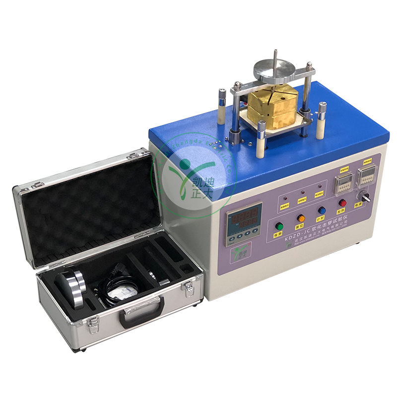 KDZD-JC軟化擊穿試驗儀用于檢測3.00mm及以下漆包線在熱狀態下漆膜軟化后的絕緣性能,根據設定的預熱溫度、試驗時間、儀器自動完成對試樣的預加熱、加負荷、加試驗電壓,達到試驗時間或試樣被擊穿時即卸負荷,發出聲光信號。該儀器采用熱電偶測溫,智能溫度控制,能自動調節和顯示試驗溫度、測試部分采用集成電路,整個測試過程自動完成。