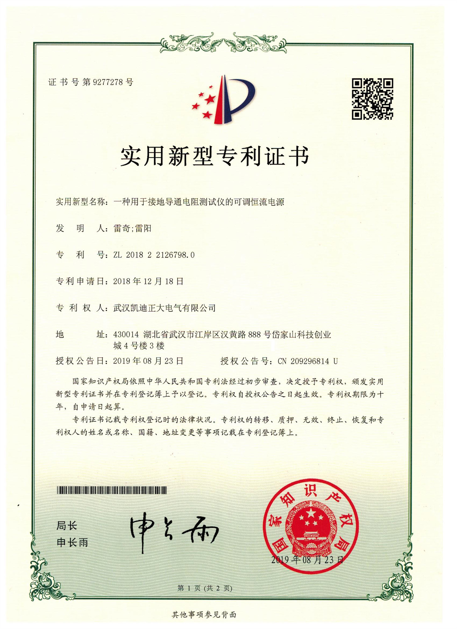 ![]() “KDHL-100A回路電阻測試儀”曾獲實用新型專利證書 |