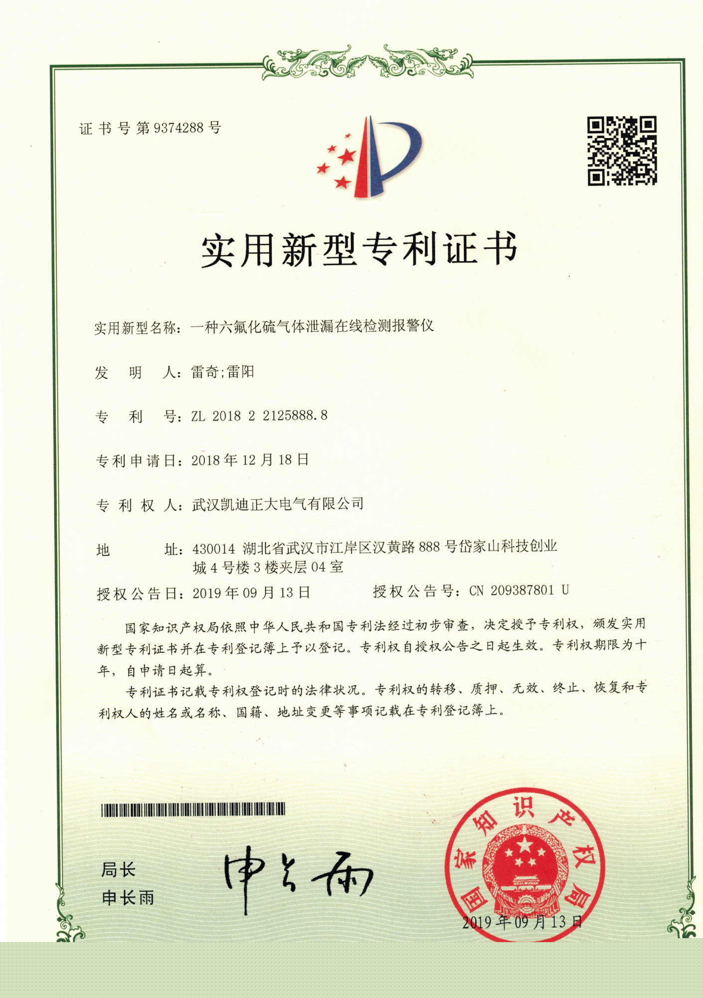 ![]() “KDXJ-8六氟化硫氣體泄漏報警系統”曾獲實用新型專利證書 |
