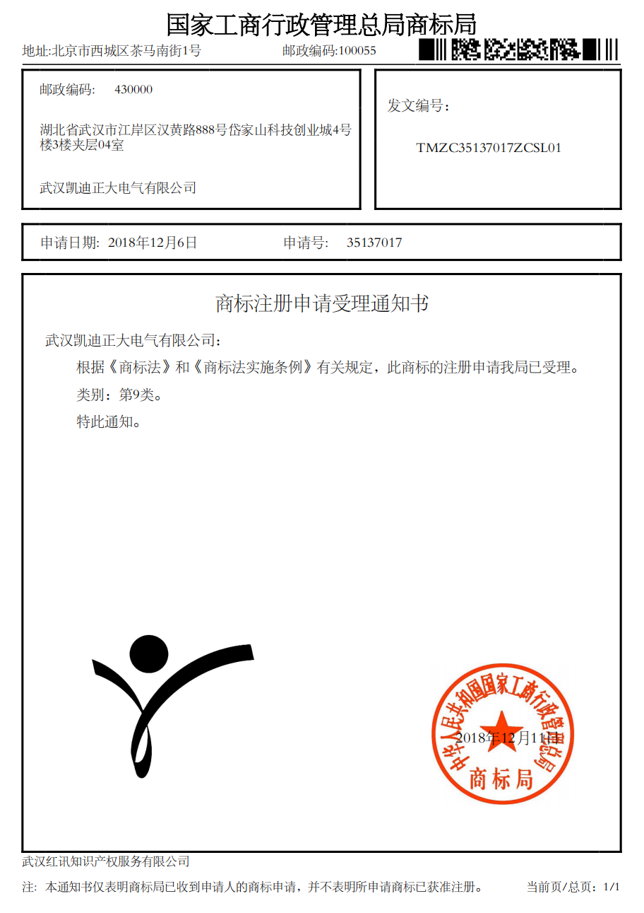 ![]() “凱迪正大LOGO”國家工商行政總局商標局受理書 |
