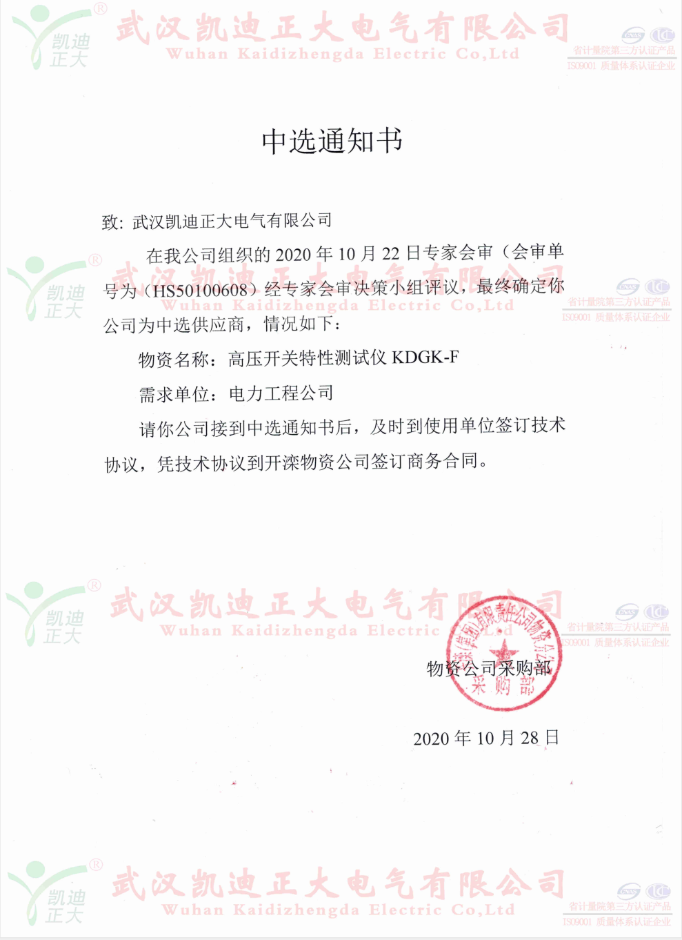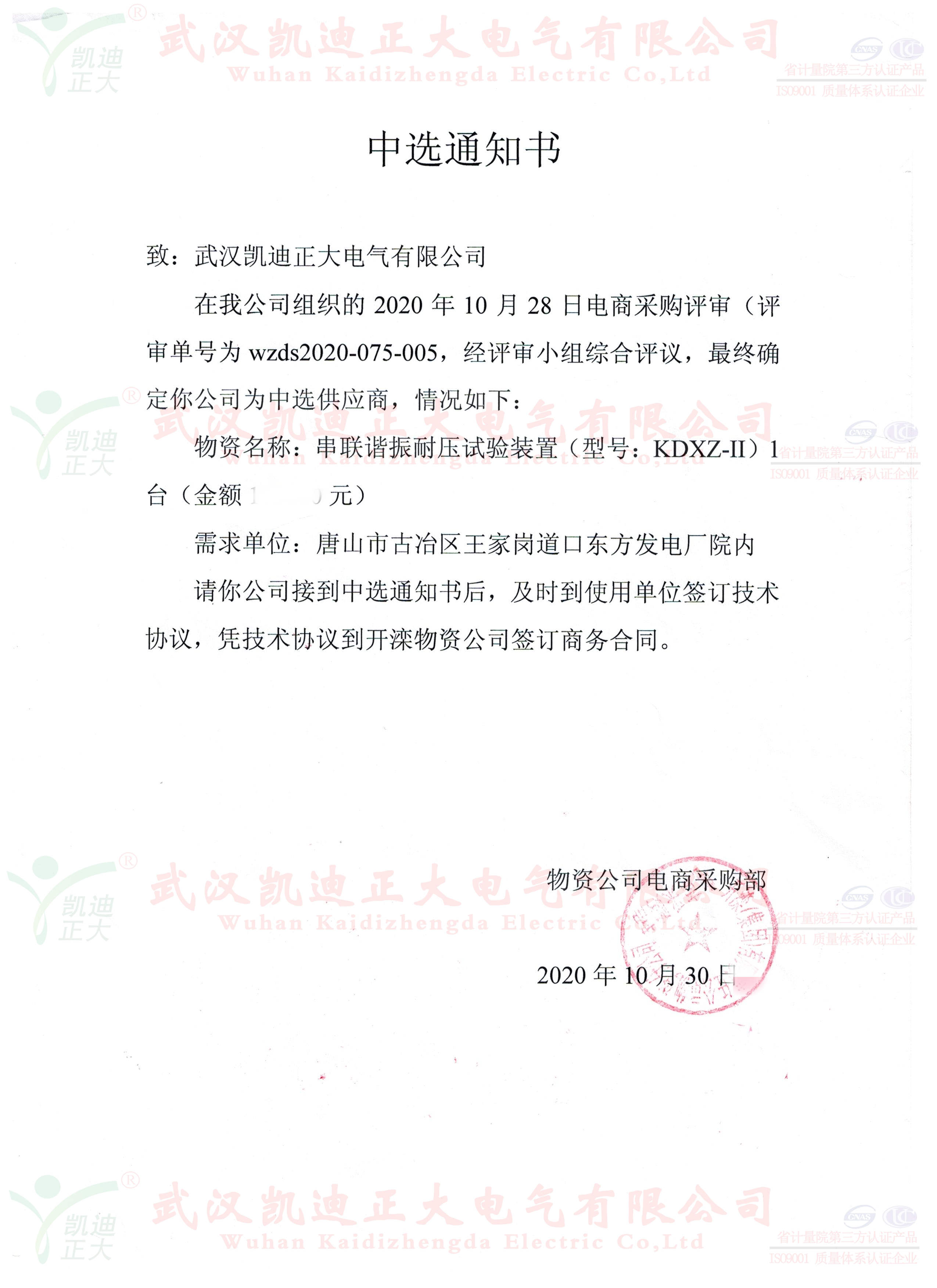 誰無暴風勁雨時,守得云開見月明。這個11月可以說是灰蒙蒙的,經歷了洗刷.......。我司與國內大型鋼鐵企業的合作,各大煤業集團均獲得訂單。這次是開灤集團的東方電廠公開詢價采購KDXZ-II串聯諧振耐壓試驗裝置、KDGK-F高壓開關機械特性測試儀等設備。在與多家電氣設備制造商的競標中,我司以優質口碑、多項專利技術、精準售后等高分獲得評標組的認可。獲得中選供應商。