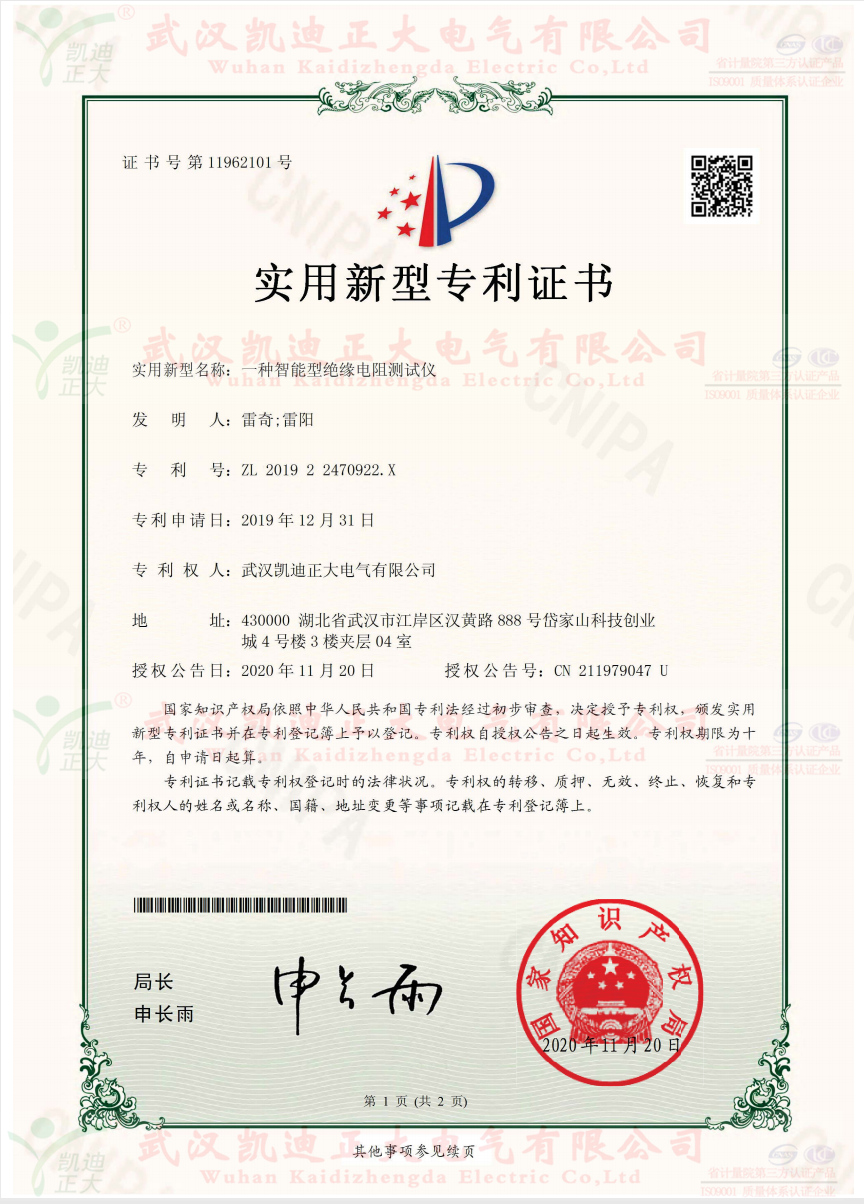 1、一種智能型絕緣電阻測試儀,證書號第11962101號,專利號:ZL 2019 2 2470922.X,發明人:雷奇;雷陽,專利權人:武漢凱迪正大電氣有限公司,授權公告號:CN 211979047 U。