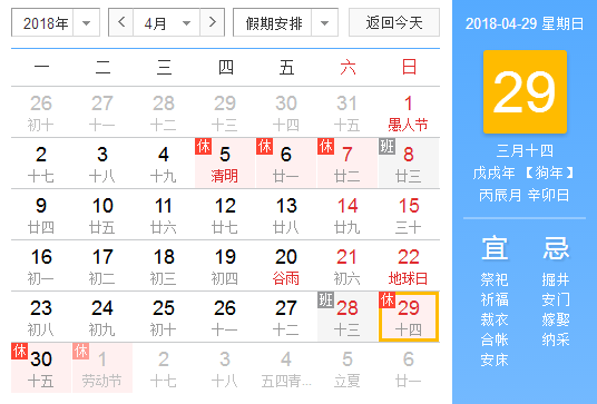 2018年五一放假安排時(shí)間表最新國(guó)務(wù)院官方發(fā)布: 4月29日(星期天)至5月1日(勞動(dòng)節(jié),星期二)放假調(diào)休,共3天。 友情提示:4月28日(星期六)上班。