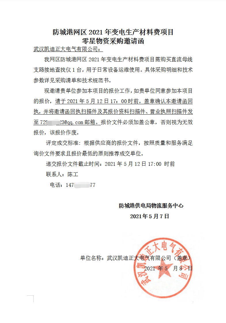 防城港網區2021年變電生產材料費項目零星物資采購邀請函