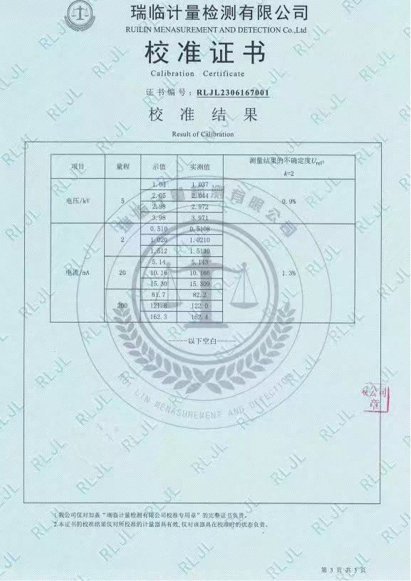 河間市質(zhì)量技術(shù)監(jiān)督檢驗(yàn)所采購(gòu)我司KDYD2675 工頻高壓測(cè)試臺(tái),應(yīng)技術(shù)要求送第三方檢測(cè)機(jī)構(gòu)瑞臨計(jì)量檢測(cè)有限公司檢定。