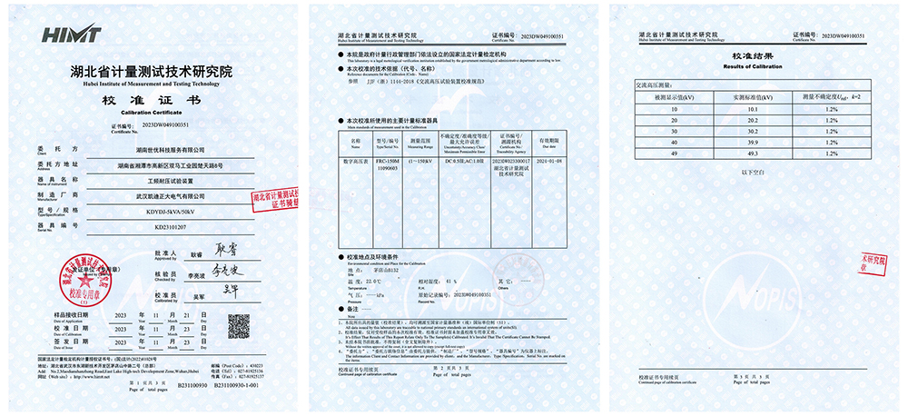 2023年11月23日,湖南世優(yōu)科技服務有限公司采購我司的KDYDJ-5KVA/50KV工頻耐壓試驗裝置,順利通過湖北省計量測試技術研究院的校準,這標志著我們的產(chǎn)品在品質和質量值得肯定。這一喜訊不僅彰顯了我們的產(chǎn)品質量,也進一步證明了我們在電力行業(yè)中的能力和信譽。