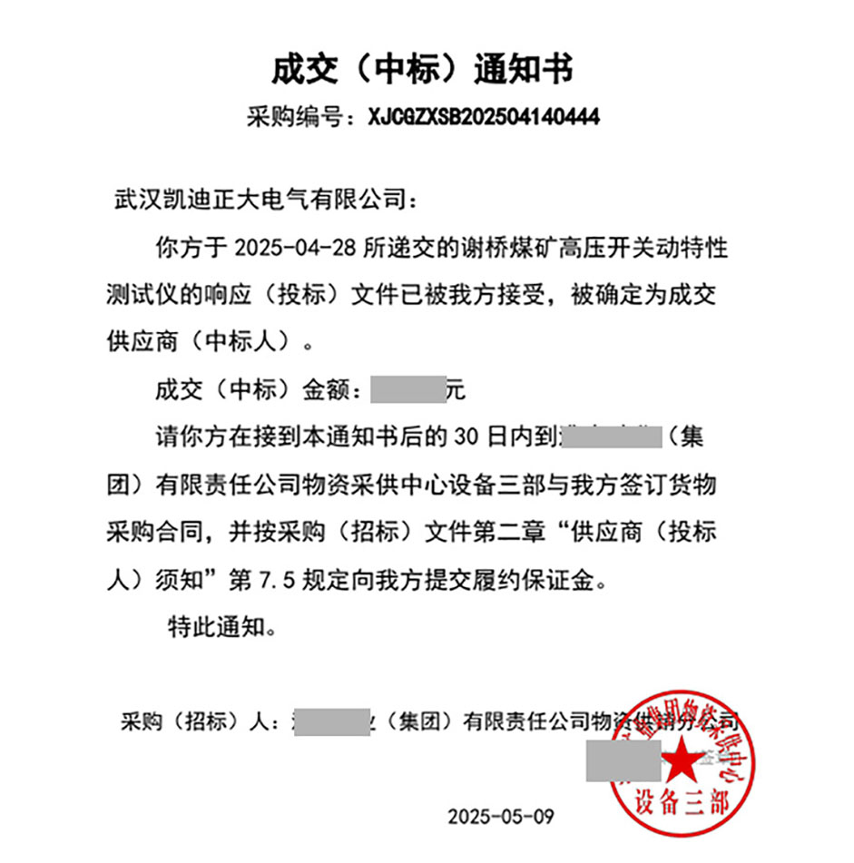 恭喜武漢凱迪正大成功中標淮南某集團高壓開關動特性測試儀項目