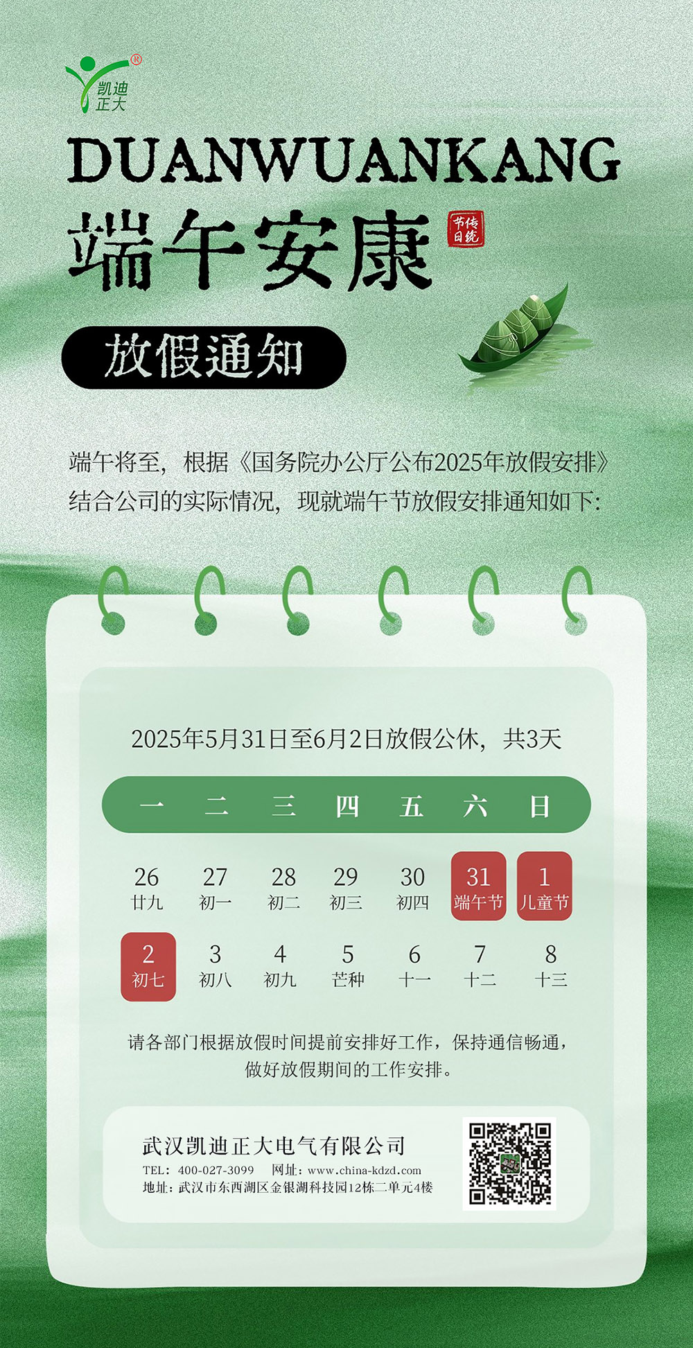 武漢凱迪正大2025年端午節放假安排的通知